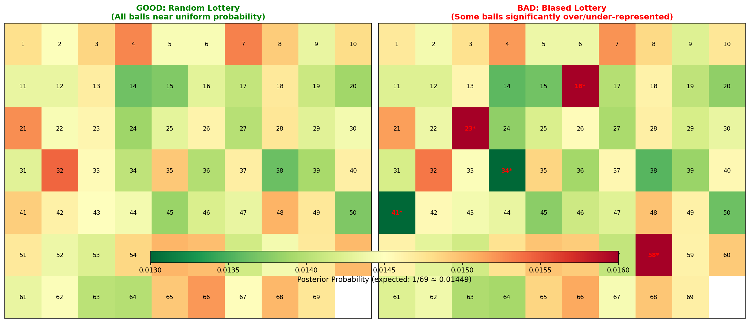 In the BAD heatmap example above, notice balls 16*, 23*, 34*, 41*, and 58* are flagged. These show statistically significant deviations from the expected frequency.