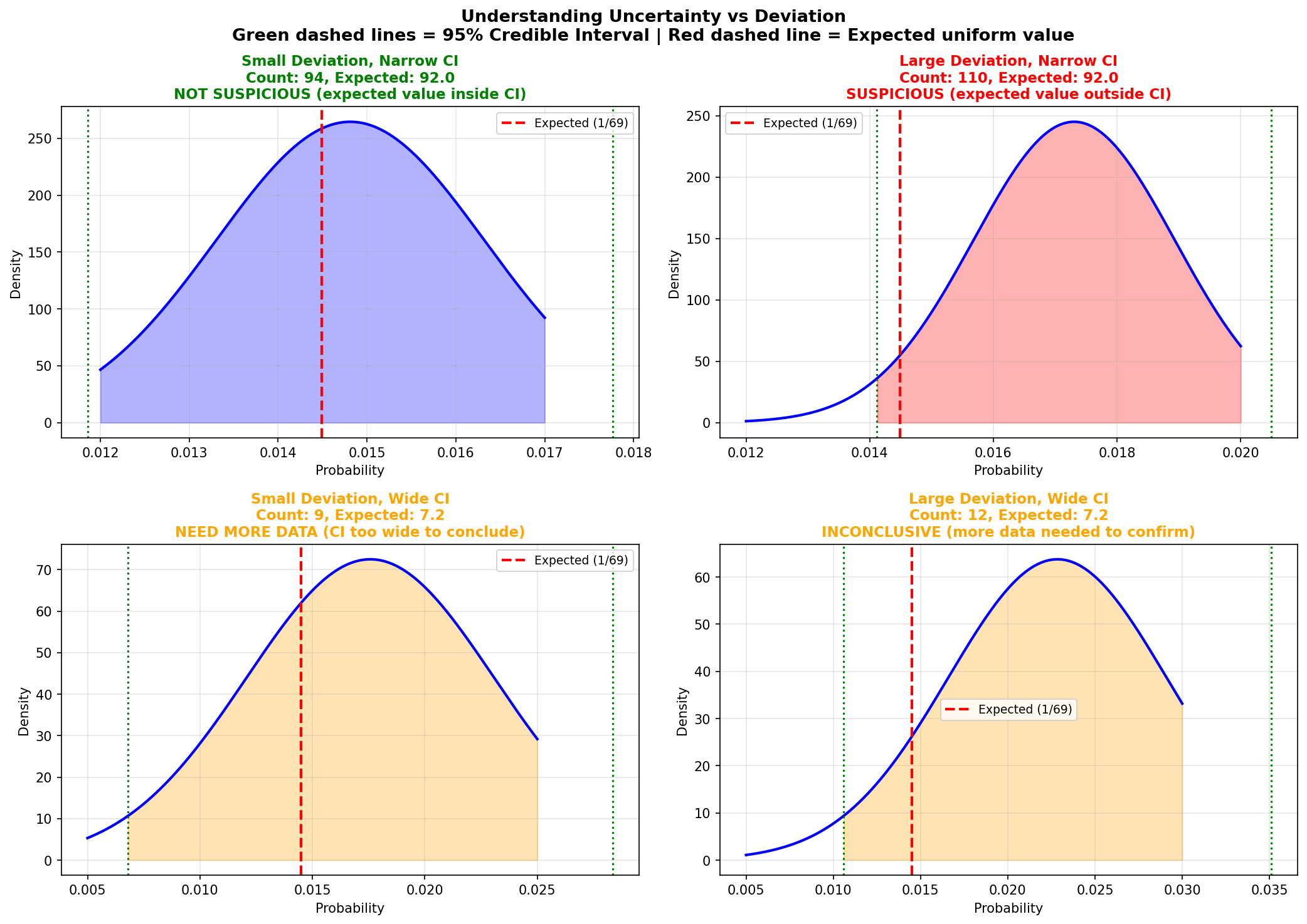 Top-left: Small deviation + narrow CI = not suspicious (expected value inside CI)